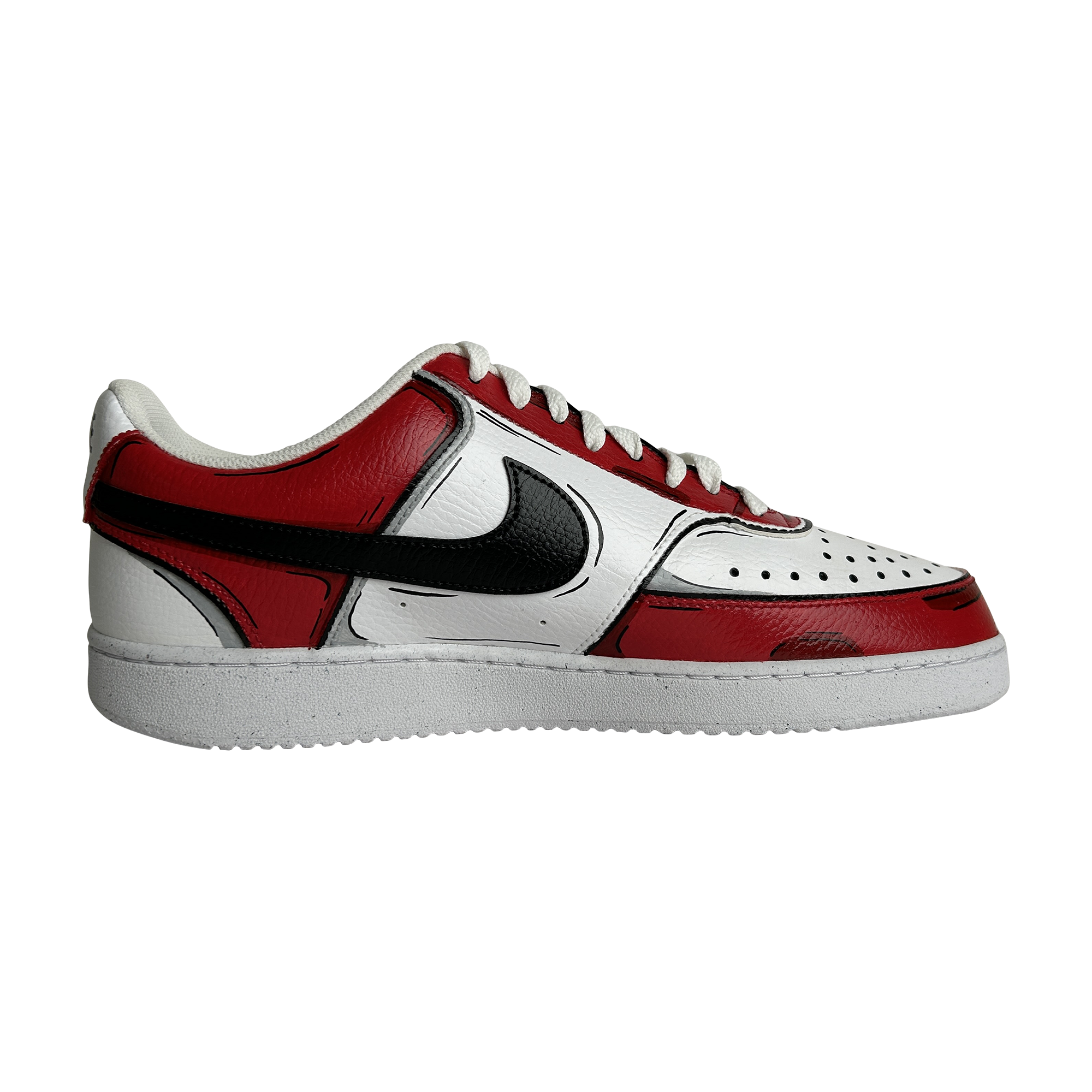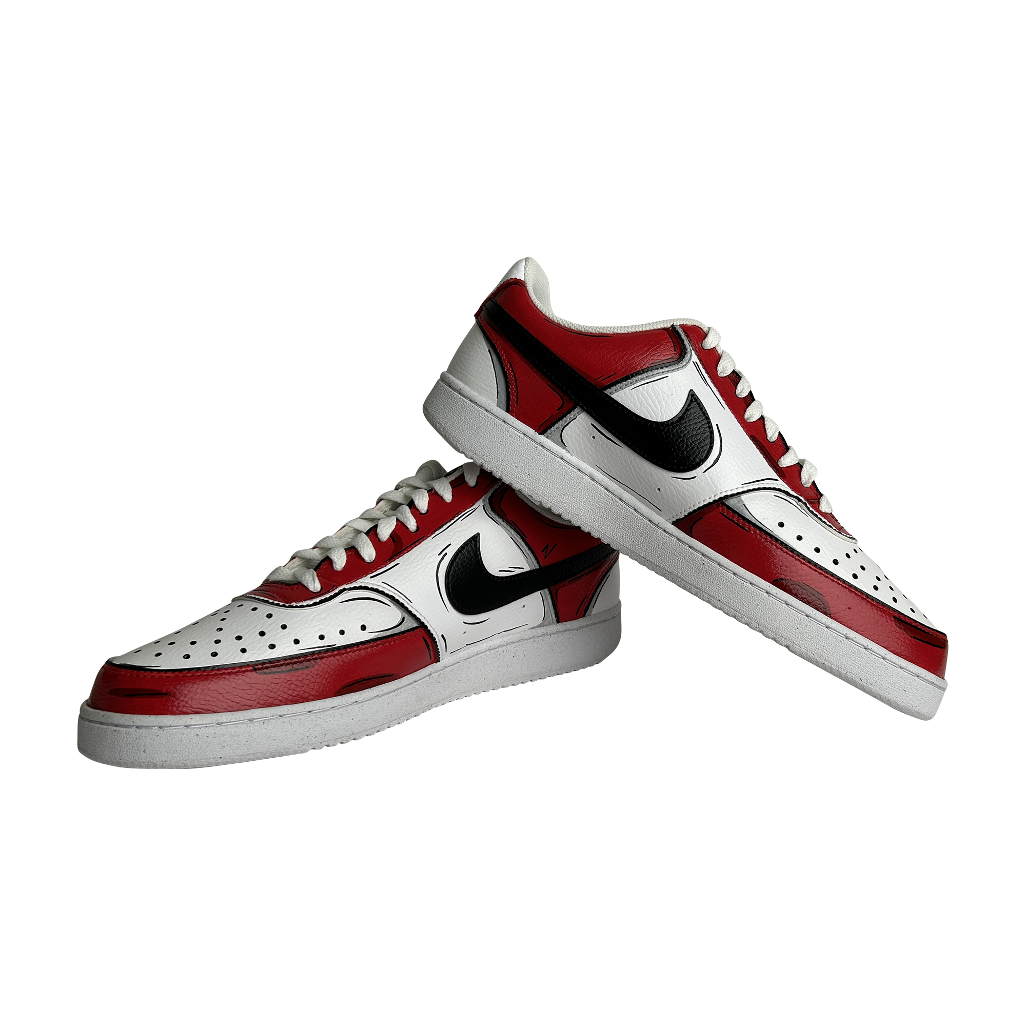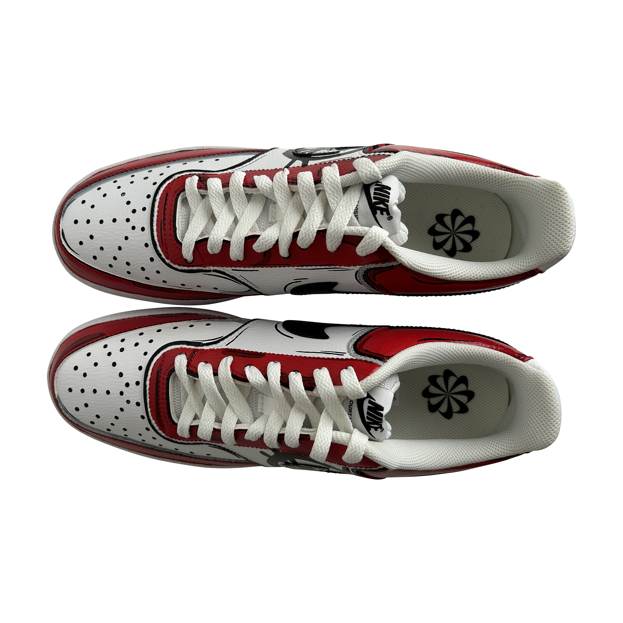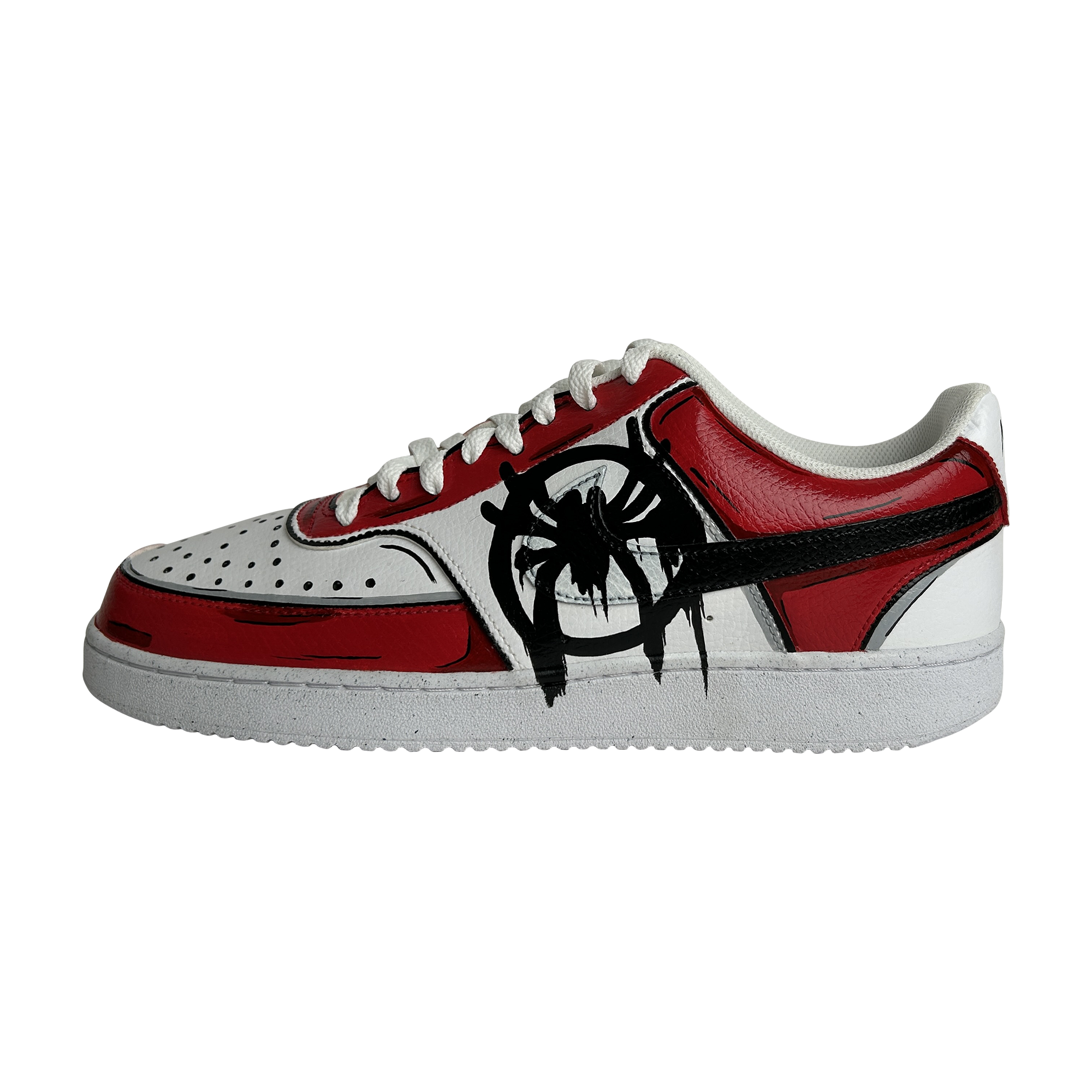 The design features a bold red-and-white base with striking black accents, highlighted by a hand-painted spider emblem across the swoosh – a nod to Spidey’s iconic suit. Each pair is finished with durable waterproof paint, ensuring the artwork stays as powerful as the hero himself.
