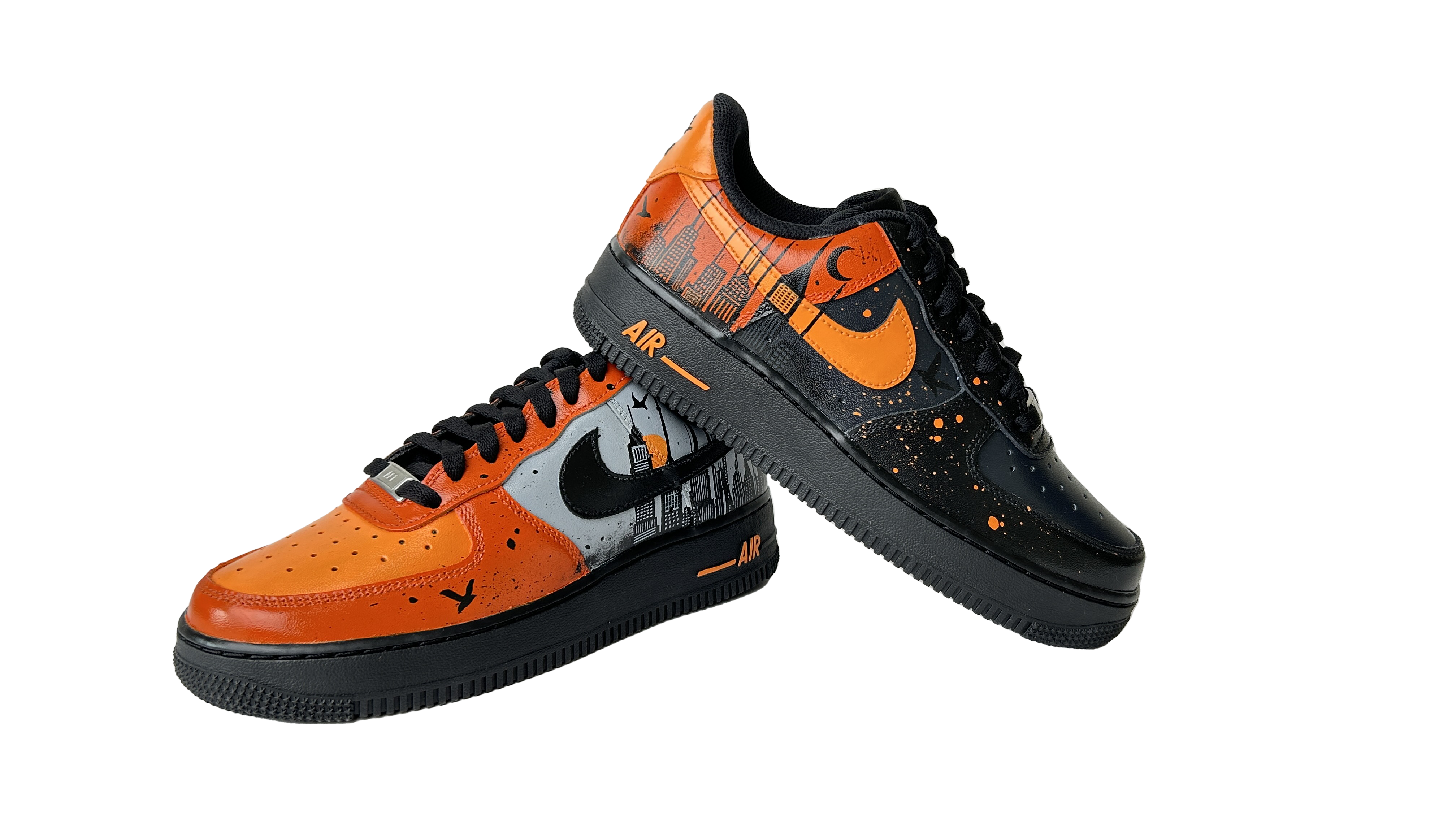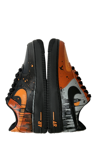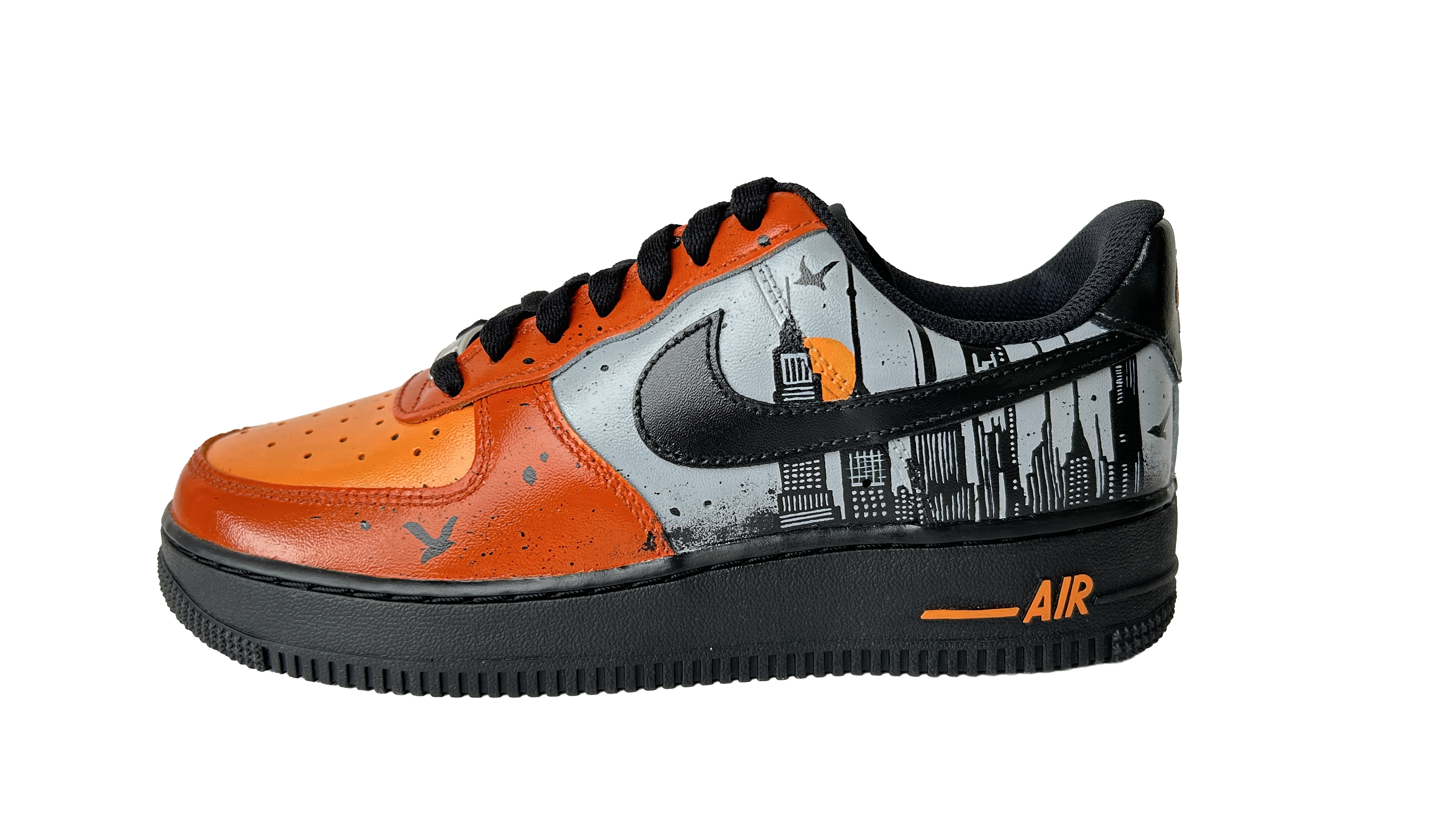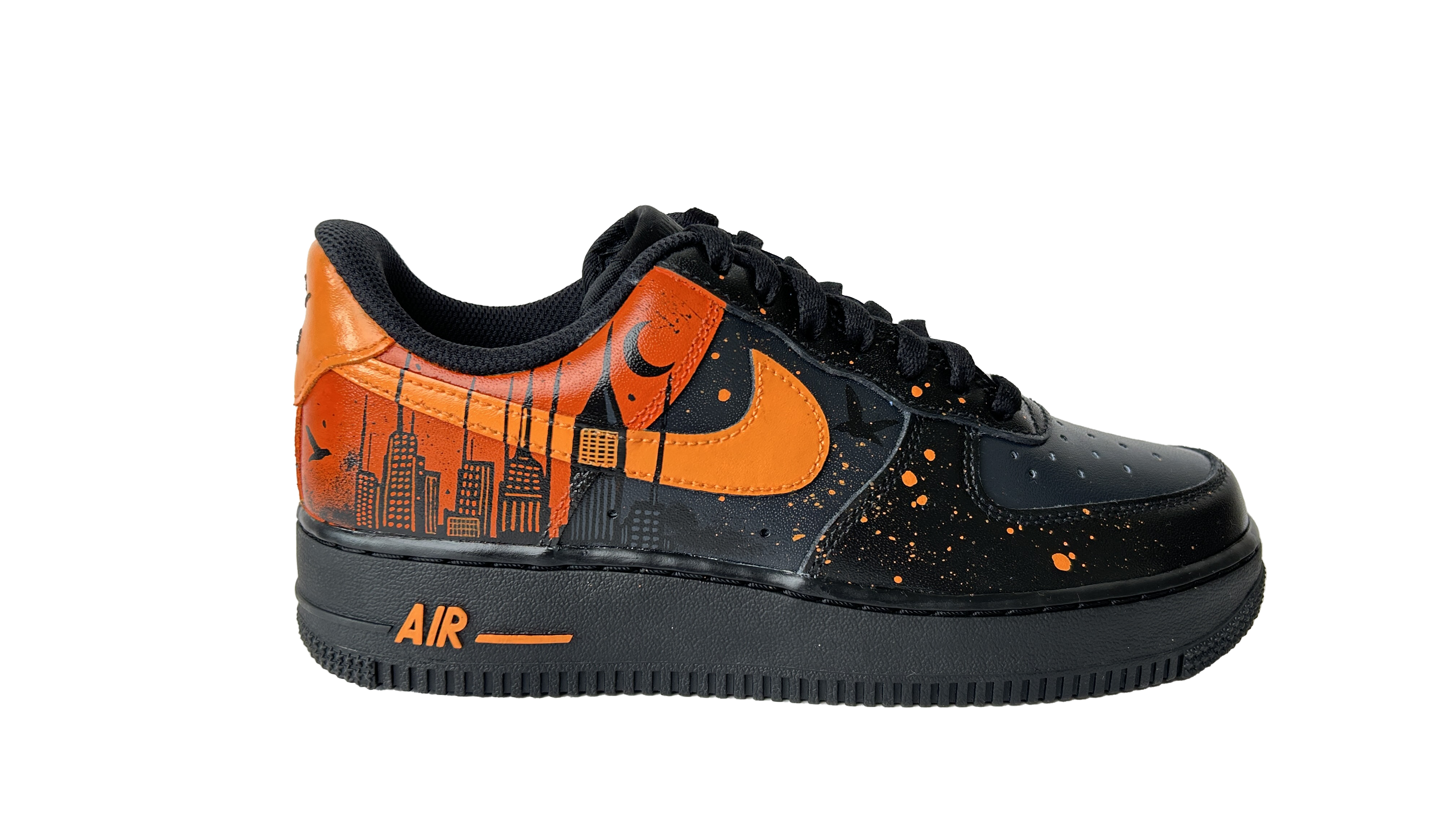 Hand-painted in rich shades of burnt orange and midnight black, these custom Air Force 1s feature a striking city skyline wrapped around the panels — detailed entirely by hand. Each pair goes through hours of masking, layering, shading, and micro-detailing to create a bold, seamless gradient and a glowing sunset effect.