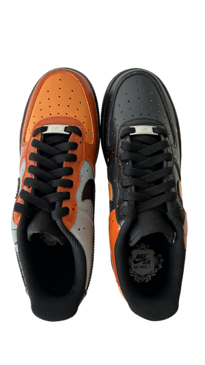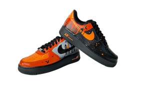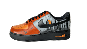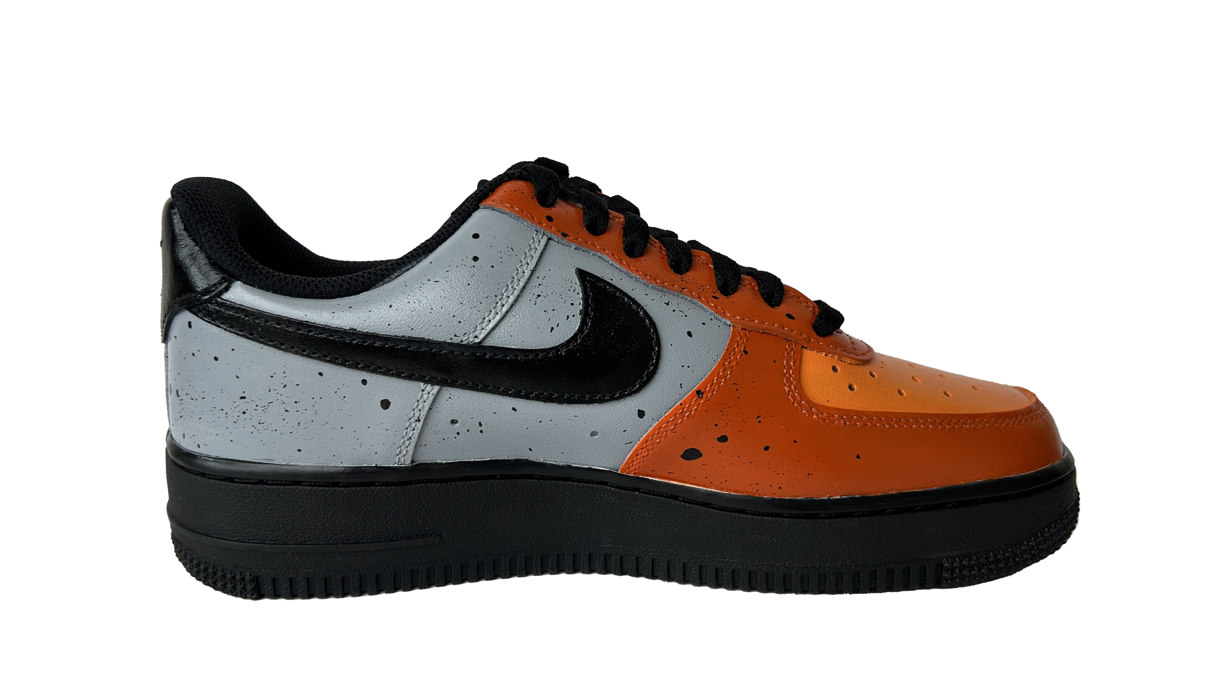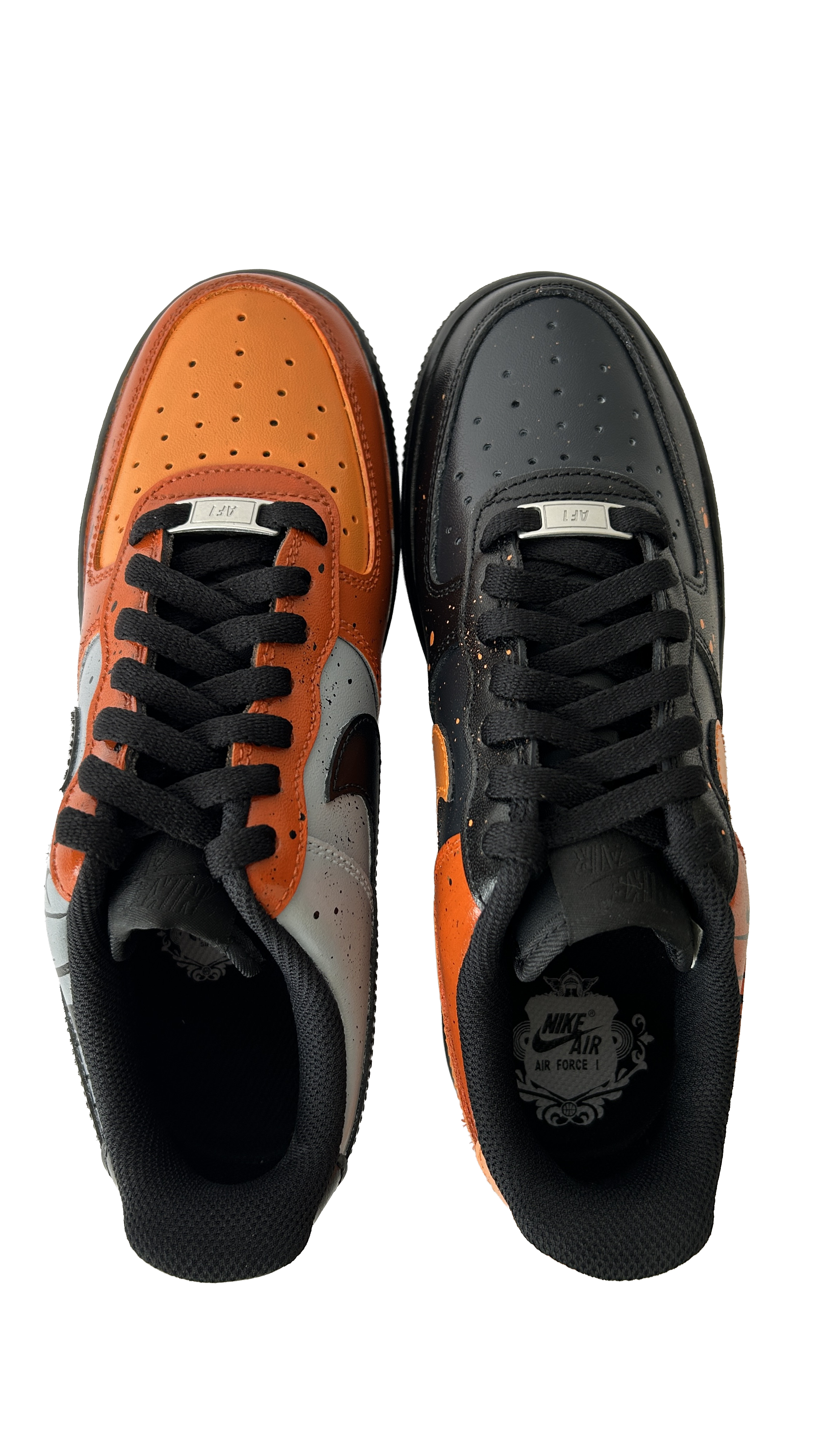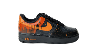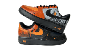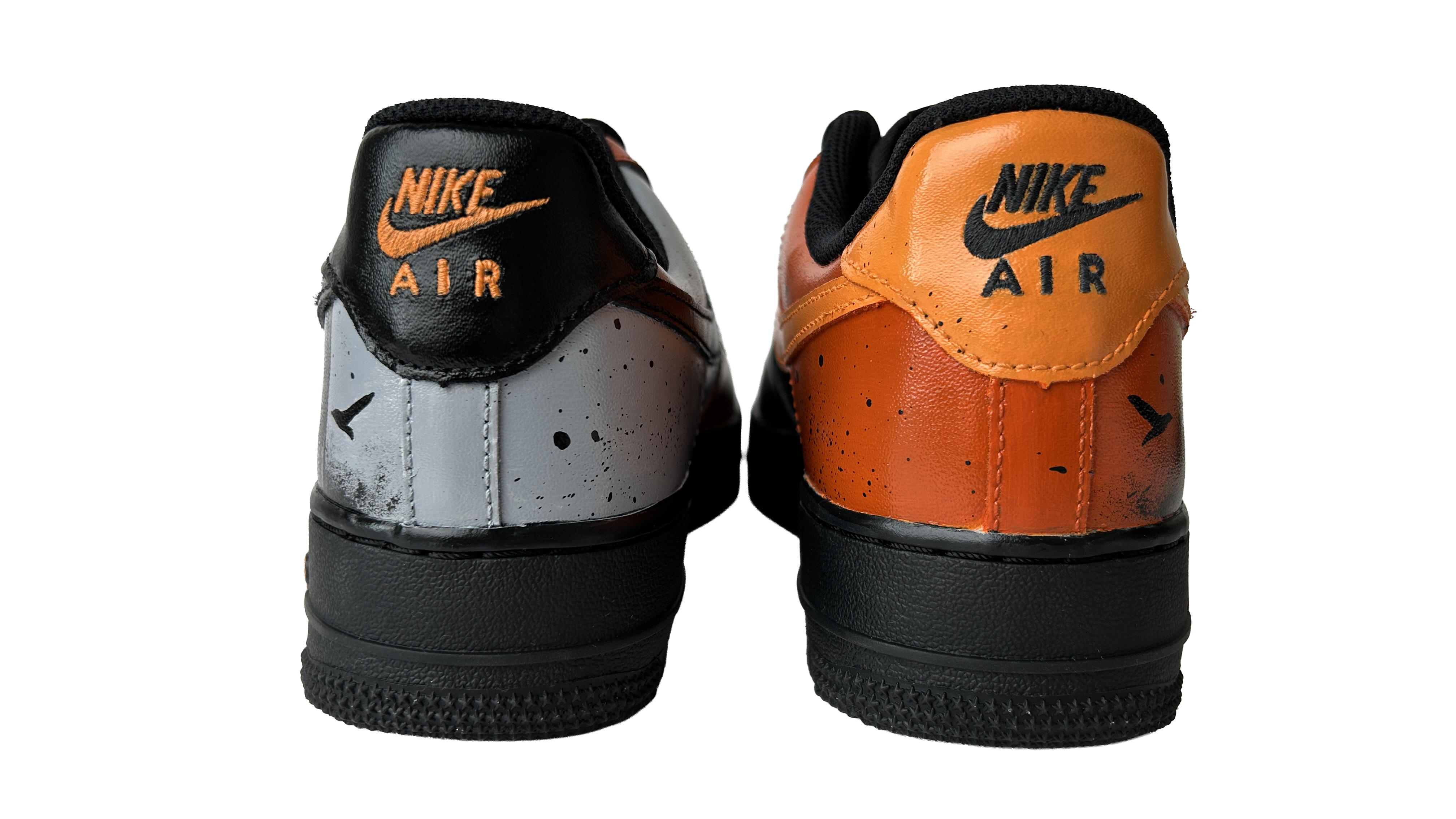 Hand-painted in rich shades of burnt orange and midnight black, these custom Air Force 1s feature a striking city skyline wrapped around the panels — detailed entirely by hand. Each pair goes through hours of masking, layering, shading, and micro-detailing to create a bold, seamless gradient and a glowing sunset effect.