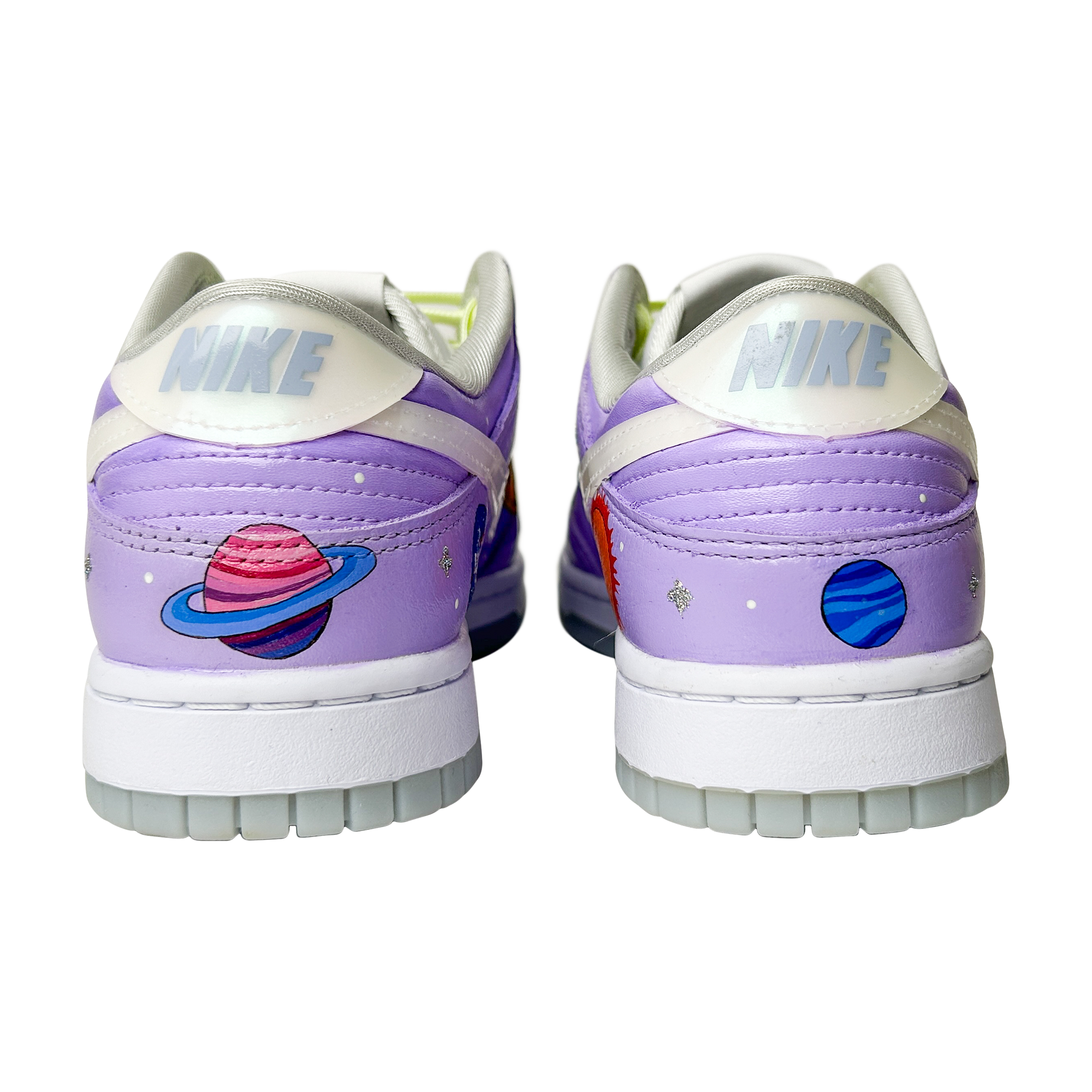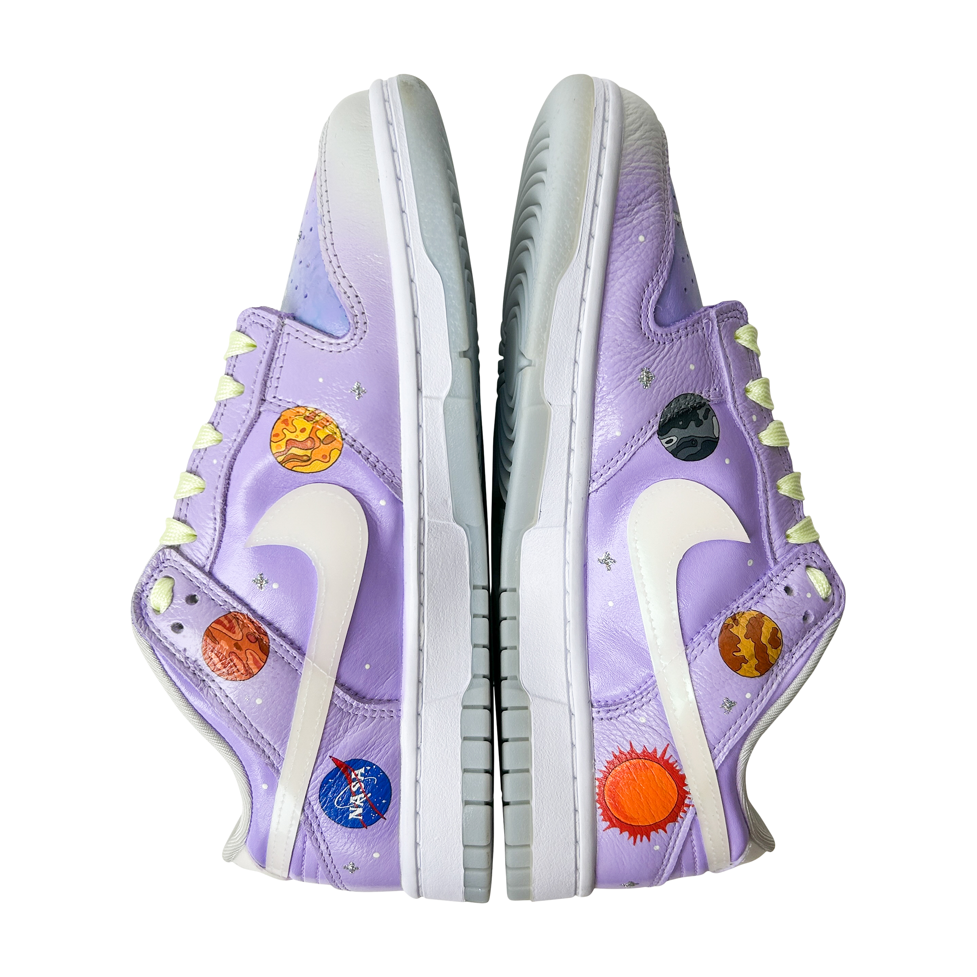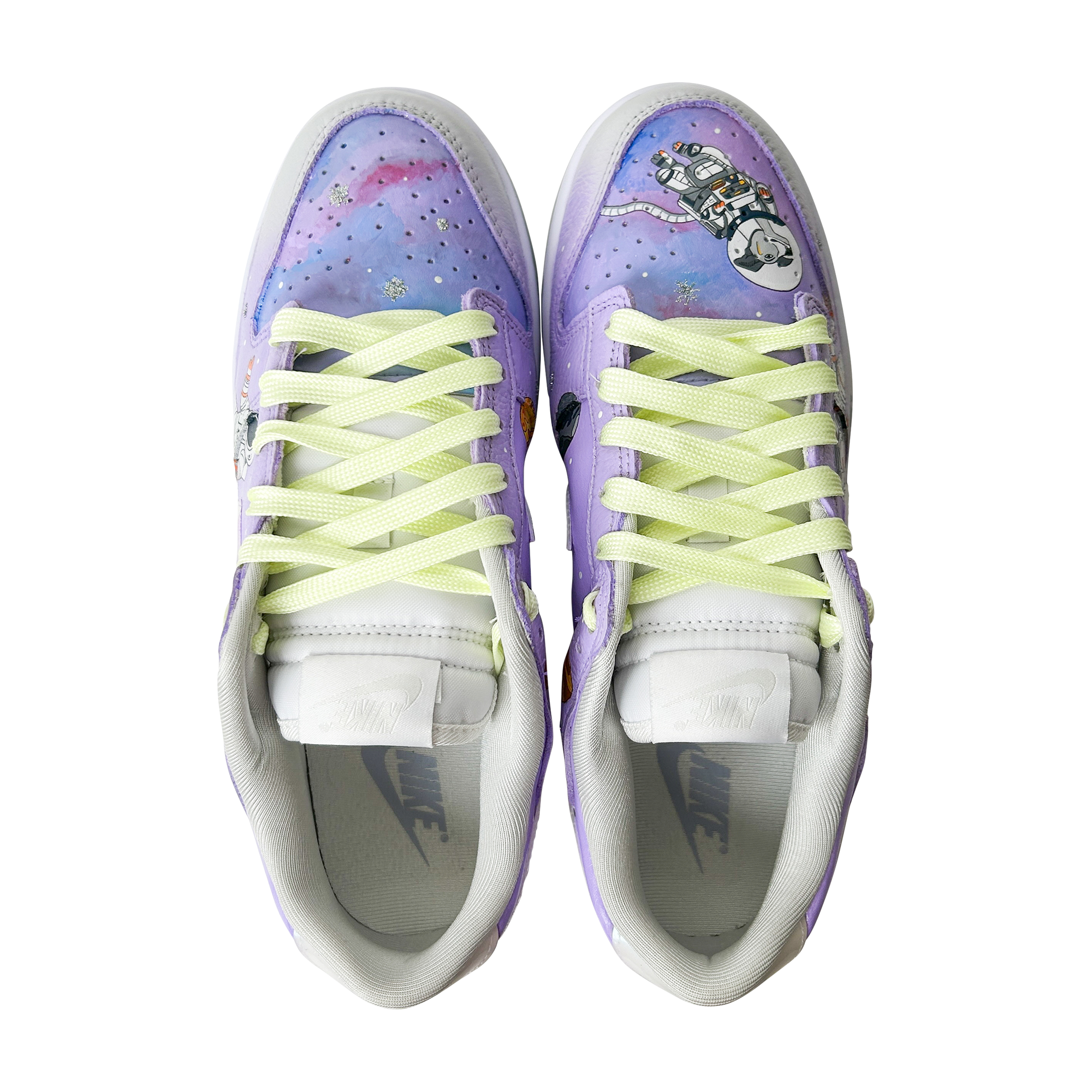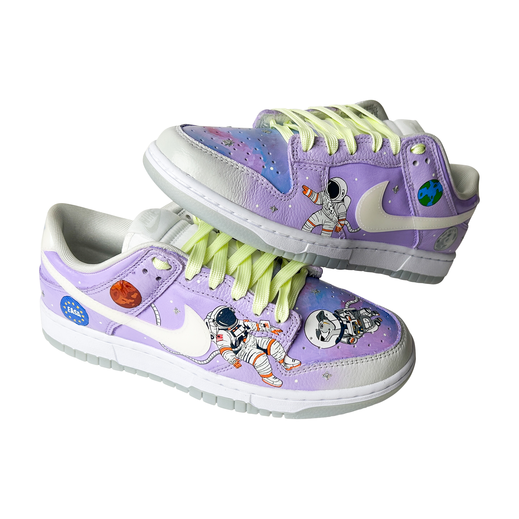 Painted in dreamy lavender galaxies with tiny stars, planets, and astronauts floating in space, this pair captures the wonder of NASA missions and the imagination of a young explorer.